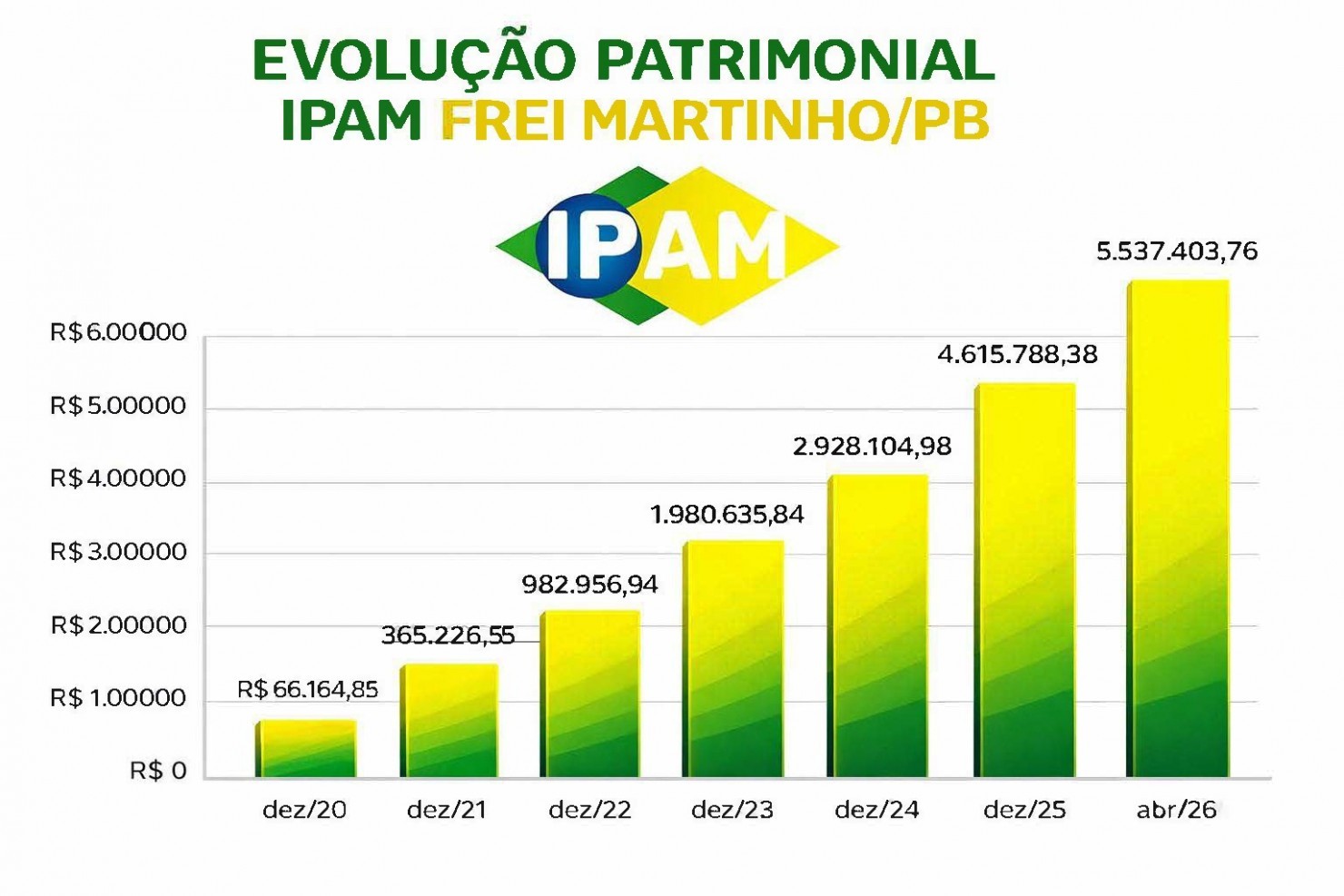 O IPAM de Frei Martinho/PB evoluiu de um patrimônio de R$ 66.164,85 (dez/2020) para R$ 5.537.403,76 (abr/2026).